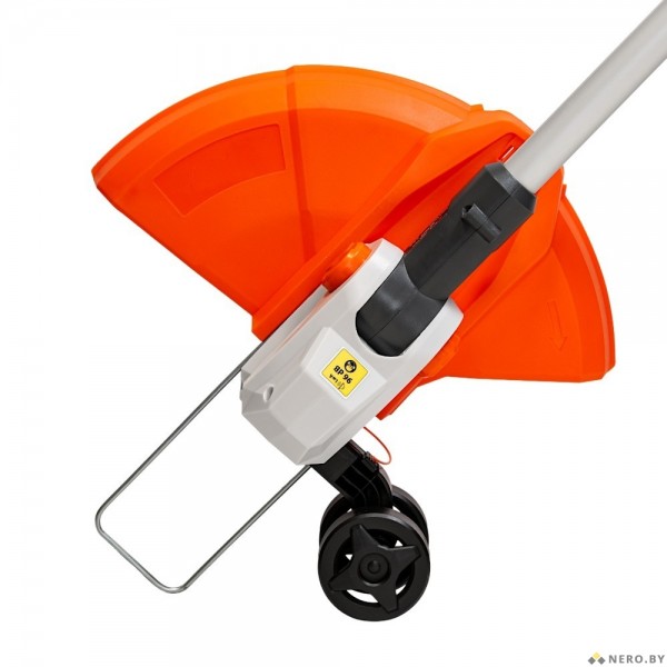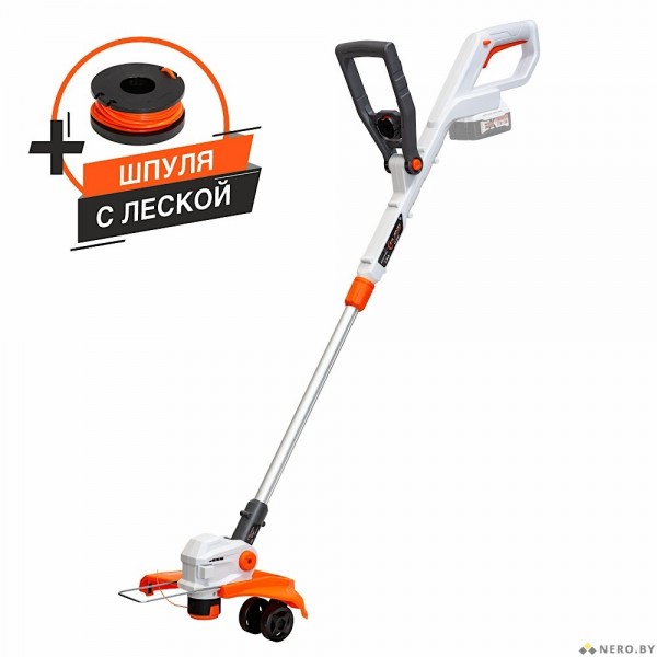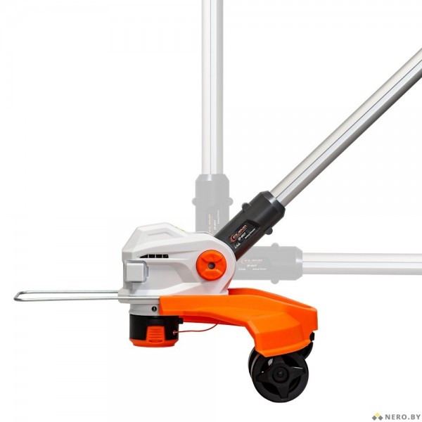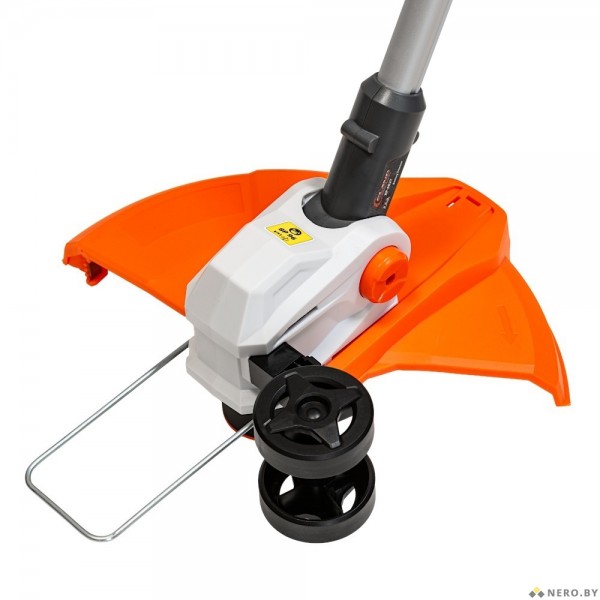 • Колесики на триммерной головке позволяют выполнять ровную кромку газона вдоль бордюров, плитки и заборов, обеспечивая стабильную глубину среза при перемещении по опорной поверхности.